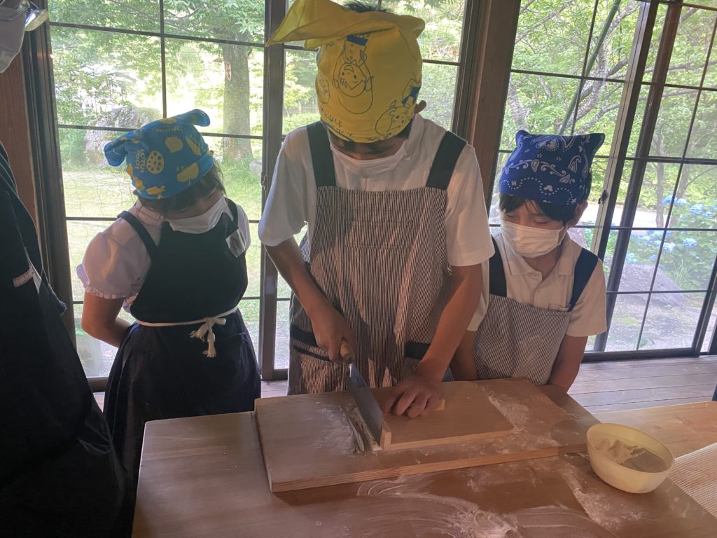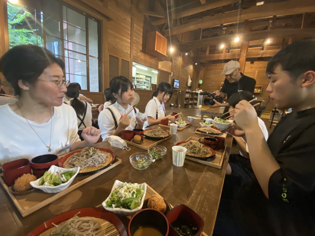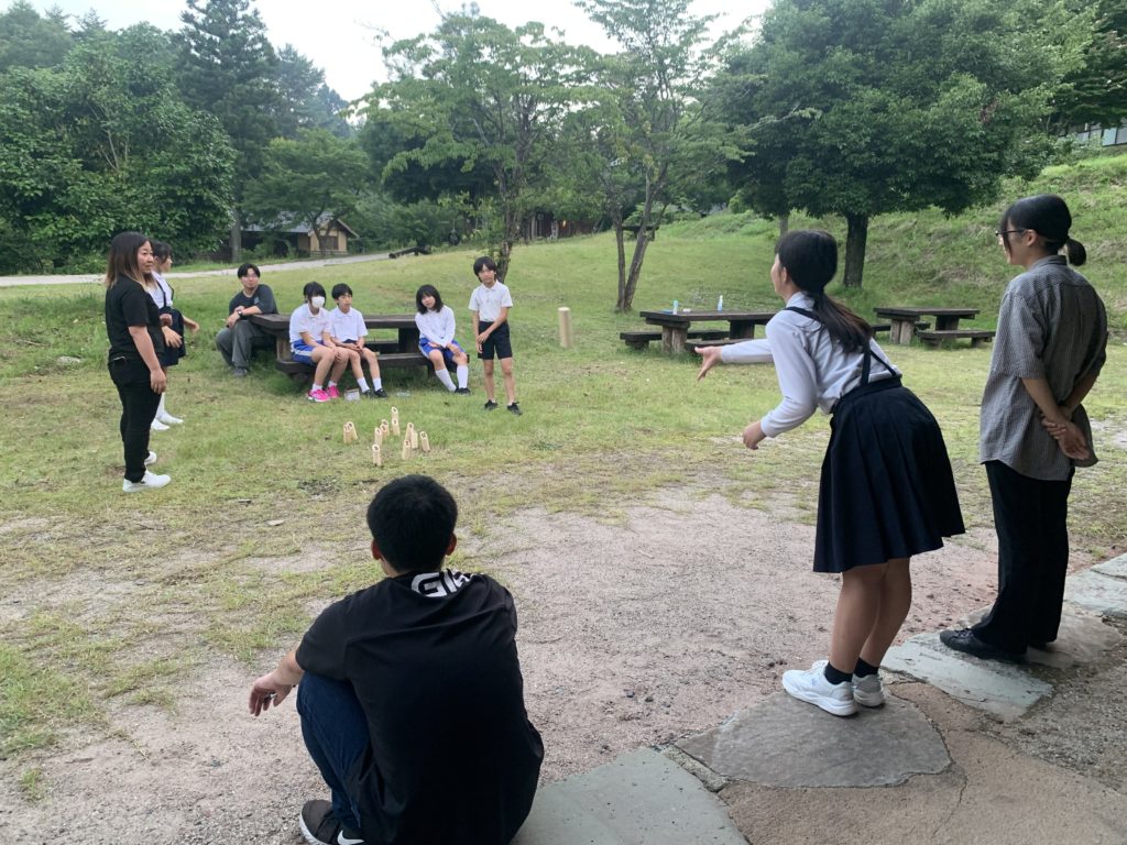 下校後は、ふるさと体験村へ!宿題をした後、そば打ち体験をしました。夕食は自分たちで打った蕎麦を食べました。その後は、県立大学生の考えたレクリエーション!モルックをしたりケイドロをしたり、全力で楽しみました。お風呂に入ってから、ホタルを見に行きました。