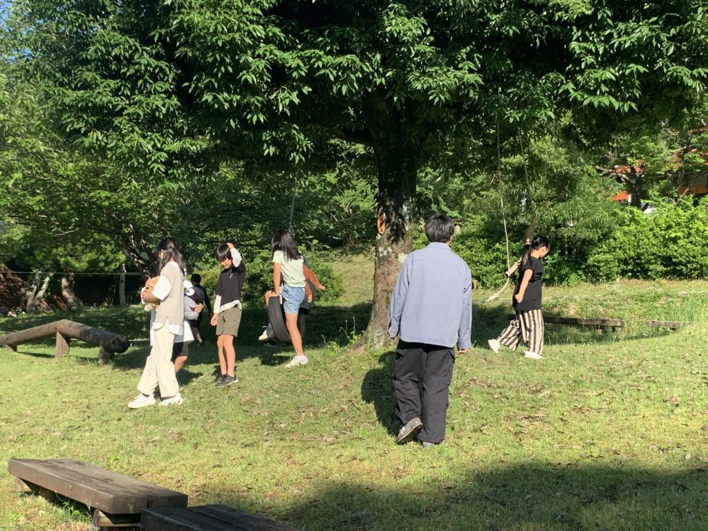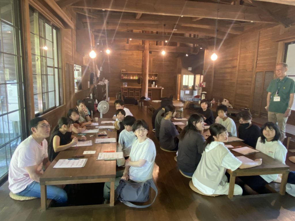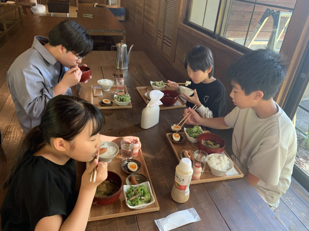 配膳をして朝食を食べました。その後は、自由時間ということでとってもいい天気の中思い思いに過ごしていました。保護者の方が来られてからは、HOOP!をみんなでしました。各家庭での様々なことのルールを親と子とどちらが決めるのか、お互いの思いを話し合いました。