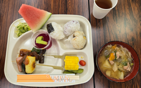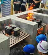 お昼ご飯は、高齢者クラブの方から火おこしを教わり、飯ごうで炊いたご飯にカレーをかけて美味しく頂きました。最後にスイカ(に見立てた風船)割りを行い締めくくりました。
