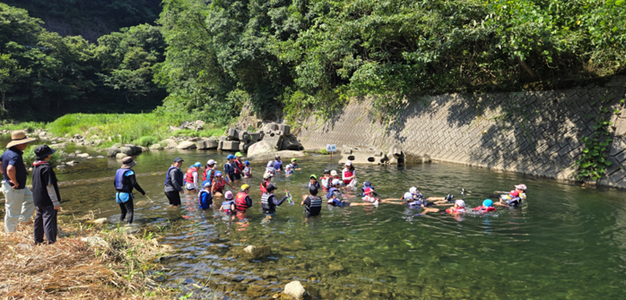 高齢者クラブ・社協・児童クラブ・まちセンで開催している川遊び交流会を今年も行いました。とても暑い日でしたが、子どもたちは川に入り「冷た~い!」とはしゃぎながら泳いだり、川の生き物を見つけたりしていました。