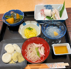 イカのおまん寿司、そうめん瓜の酢の物、かぼちゃと刻み昆布の煮物、そうめんのお吸い物、ところてん、盆だんご