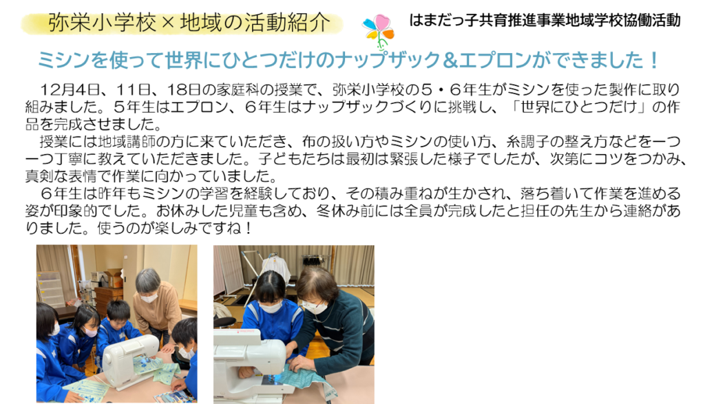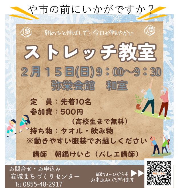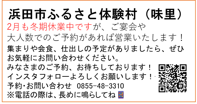 HOME > 弥栄町みらい便り > 弥栄町みらい便り 令和8年2月号 弥栄町みらい便り 2026年1月30日 第16回 ミニ劇場弥栄の朝市「や市」ストレッチ教室第19回 どぶろくの里弥栄神楽まつり浜田市ふるさと体験村 味里情報やさか表現大学モルック体験非常食防災アレンジレシピ完成!弥栄図書館クリスマスコンサートミニ門松づくり教室はまだっ子共育推進事業15時ラジオ体操地区サポ情報弥栄俳句会 第16回 ミニ劇場 弥栄の朝市「や市」 ストレッチ教室 第19回 どぶろくの里弥栄神楽まつり 詳しくはこちらのページをご覧ください↓↓ 第19回 どぶろくの里弥栄神楽まつり日本遺産にも認定されている、島根県浜田市の伝統芸能「石見神楽」。その魅力を存分に味わえる「どぶろくの里 弥栄神楽まつり」を開催します。豪快な舞、表情豊かな神楽面、太鼓と笛が織りなす力強い音色。演目ごと ... 浜田市ふるさと体験村 味里情報 やさか表現大学 モルック体験 非常食防災アレンジレシピ完成! 弥栄図書館 クリスマスコンサート ミニ門松づくり教室 はまだっ子共育推進事業 15時ラジオ体操 地区サポ情報 弥栄俳句会 -弥栄町みらい便り